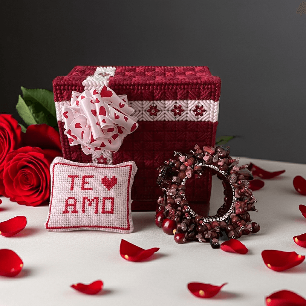 Perfect for gifting on special occasions, such as Valentine's Day, as it comes in a gift-ready canvas box and cross-stitch pillow, available in Spanish or English, also handmade.