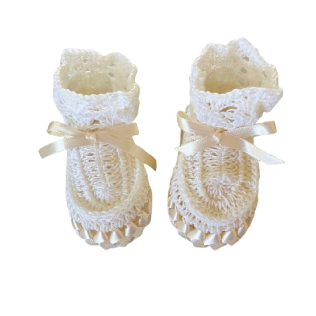 Handmade crochet booties adorned with delicate ribbons, combining style and comfort for little feet.