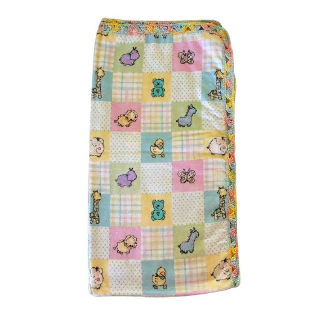 Baby blanket, made of soft flannel fabric, featuring crocheted edges in multicolored yarns, providing a cozy and handcrafted touch. Its approximate size of 36 inches makes it ideal for cuddling, snuggling, and providing warmth at any time.